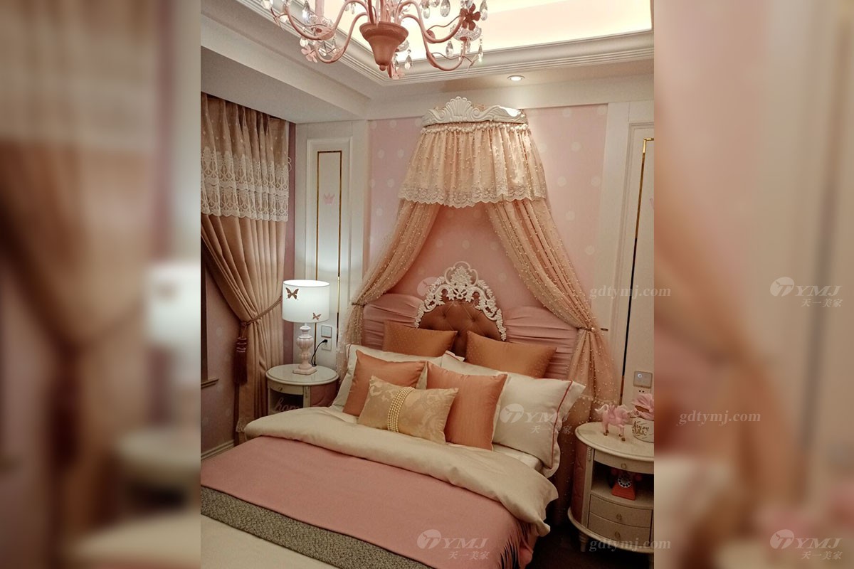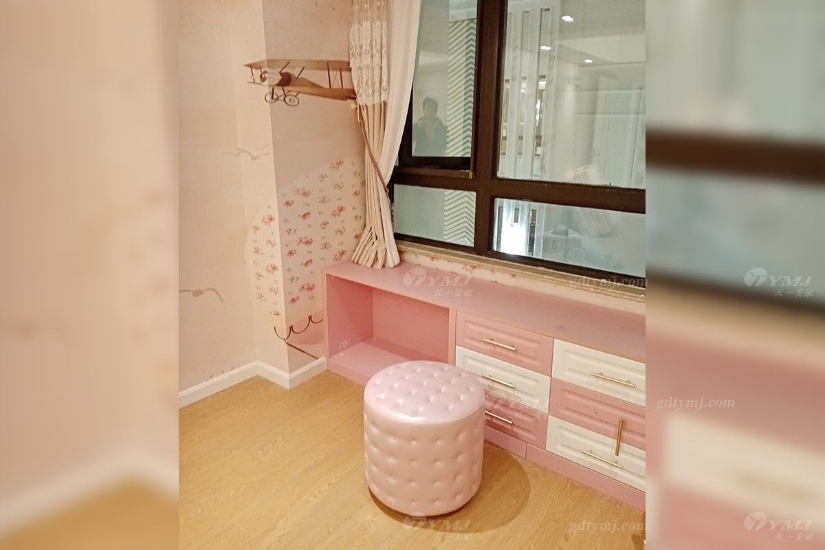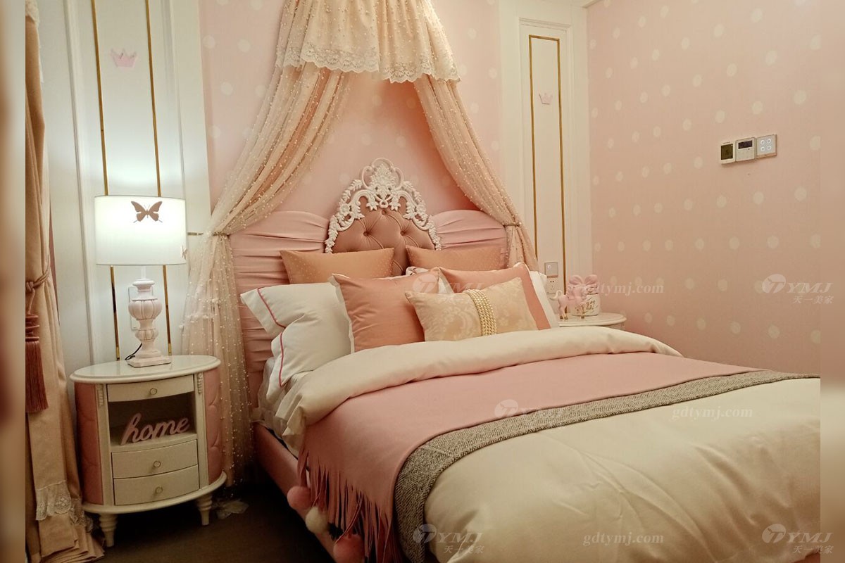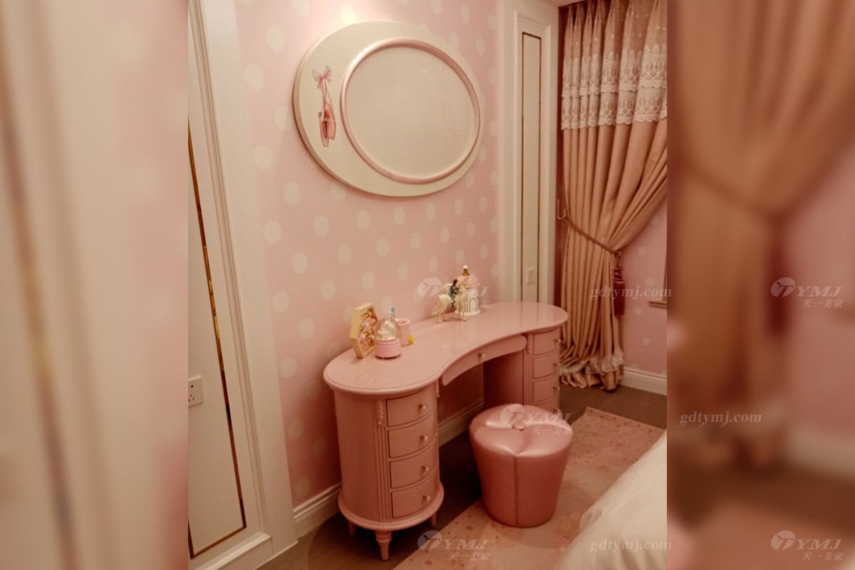 女兒房以粉色、白色為基調(diào)的墻飾面,加了一些童趣的圖案和五金裝飾,再搭配浪漫優(yōu)雅的粉色家具、軟裝布藝,使得整個空間色調(diào)上非常柔和、溫馨的感覺。