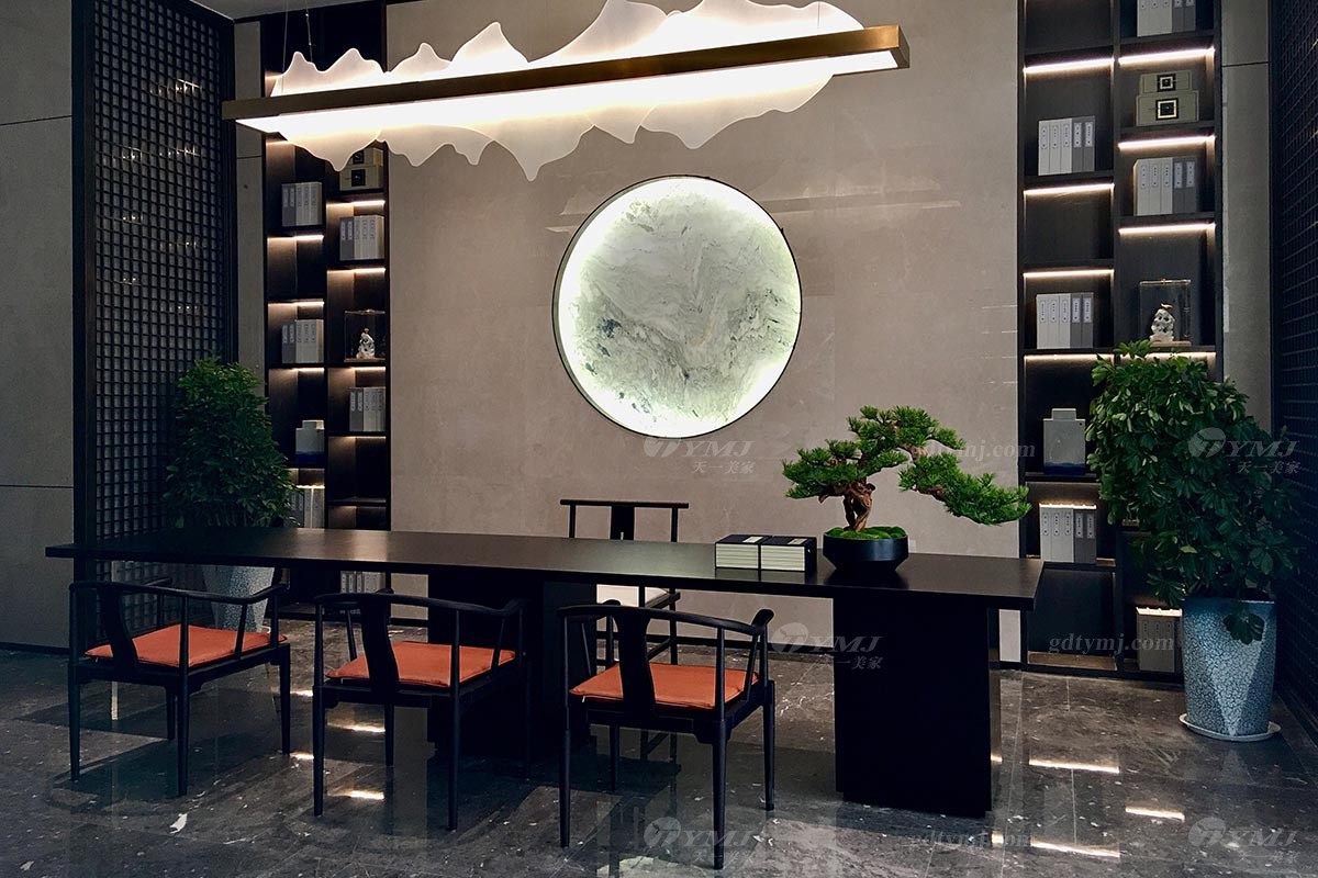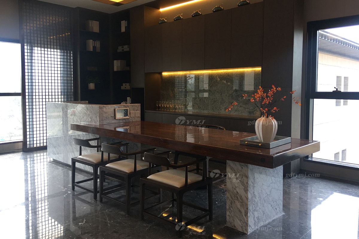 辦公區(qū)的辦公家具,選色鮮明,檸檬綠作為隔離板。整體感覺活躍充滿活力。董事長辦公室,依然是選用新中式的風(fēng)格為主。大理石的背景墻與吊燈搭配,把吊燈的光反光在背景大理石上,頓時辦公室里氣場十足,高端而不奢華,沉穩(wěn)而不高調(diào)。圓形餐桌的黑金色搭配,詮釋出既張揚(yáng)又穩(wěn)重的豪奢感。暗金色帶菱格紋的皮革,精細(xì)地包裹于餐椅的黑色框架中,柔和洗練的腿部線條以一點(diǎn)點(diǎn)的鍍金,呼應(yīng)了整套組合,演繹了360度無死角的完美效果。