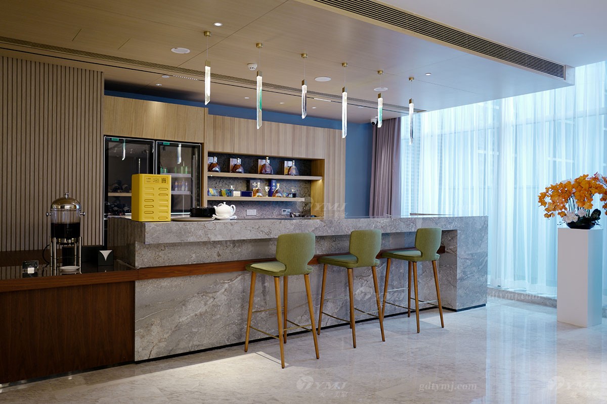 穿過電梯過道,即是酒店前臺(tái)服務(wù)大堂,空間敞亮,原木色木條裝飾而成的吊頂,造型獨(dú)特的不銹鋼金屬球形燈,別具一格。隔壁的吧臺(tái)由實(shí)木結(jié)合大理石打造而成,旁邊一張兩米多實(shí)木長功能桌,紋理深邃細(xì)膩,凸顯高質(zhì)感和檔次,可以點(diǎn)一杯咖啡,坐在吧椅上跟朋友一起細(xì)細(xì)品味、隨意聊天,很是愜意。
