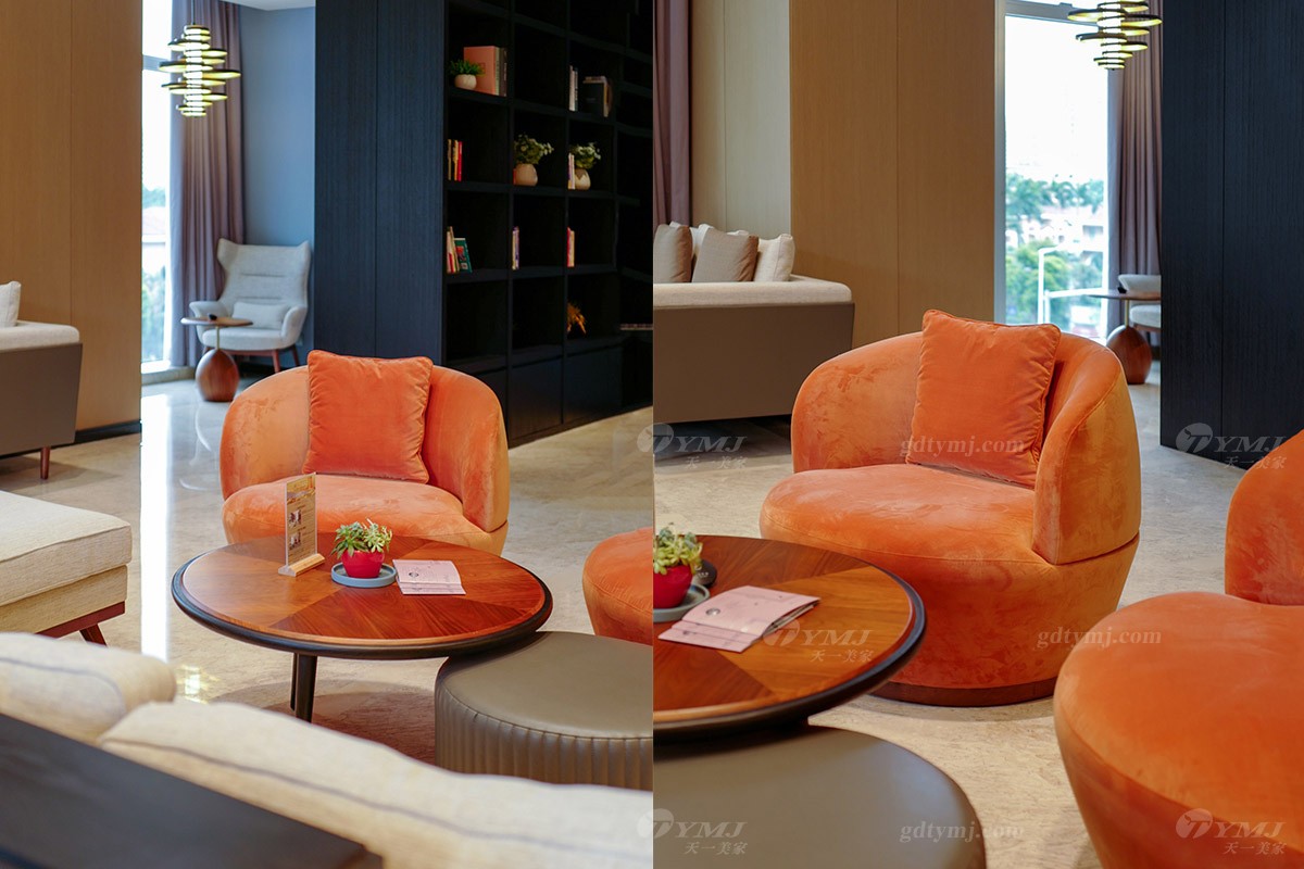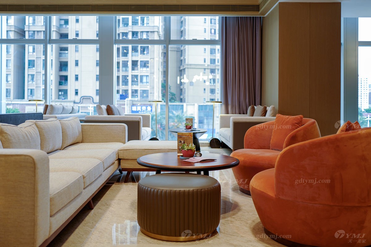 公共休閑洽談區(qū)擁有270°全景超大落地窗,自然采光非常充足,挑高的天花頂,讓空間通透明亮,柔和的燈光下,整體呈現(xiàn)灰色調(diào)布藝沙發(fā)中散落幾抹亮橙色休閑椅,使得整個(gè)氛圍活躍起來,搭配精致的裝飾,讓每一處細(xì)節(jié)都透露著不凡的品味。在繁忙的旅程或商務(wù)日程中,這是一處不錯(cuò)的靜謐而又不失格調(diào)的休憩之地,坐在舒適沙發(fā)上既可覓得片刻寧靜的個(gè)人時(shí)光,亦或可與重要伙伴閑聊、會(huì)談。