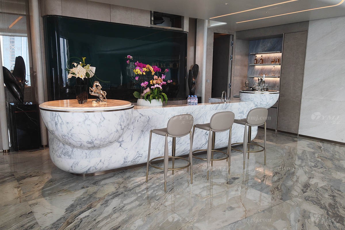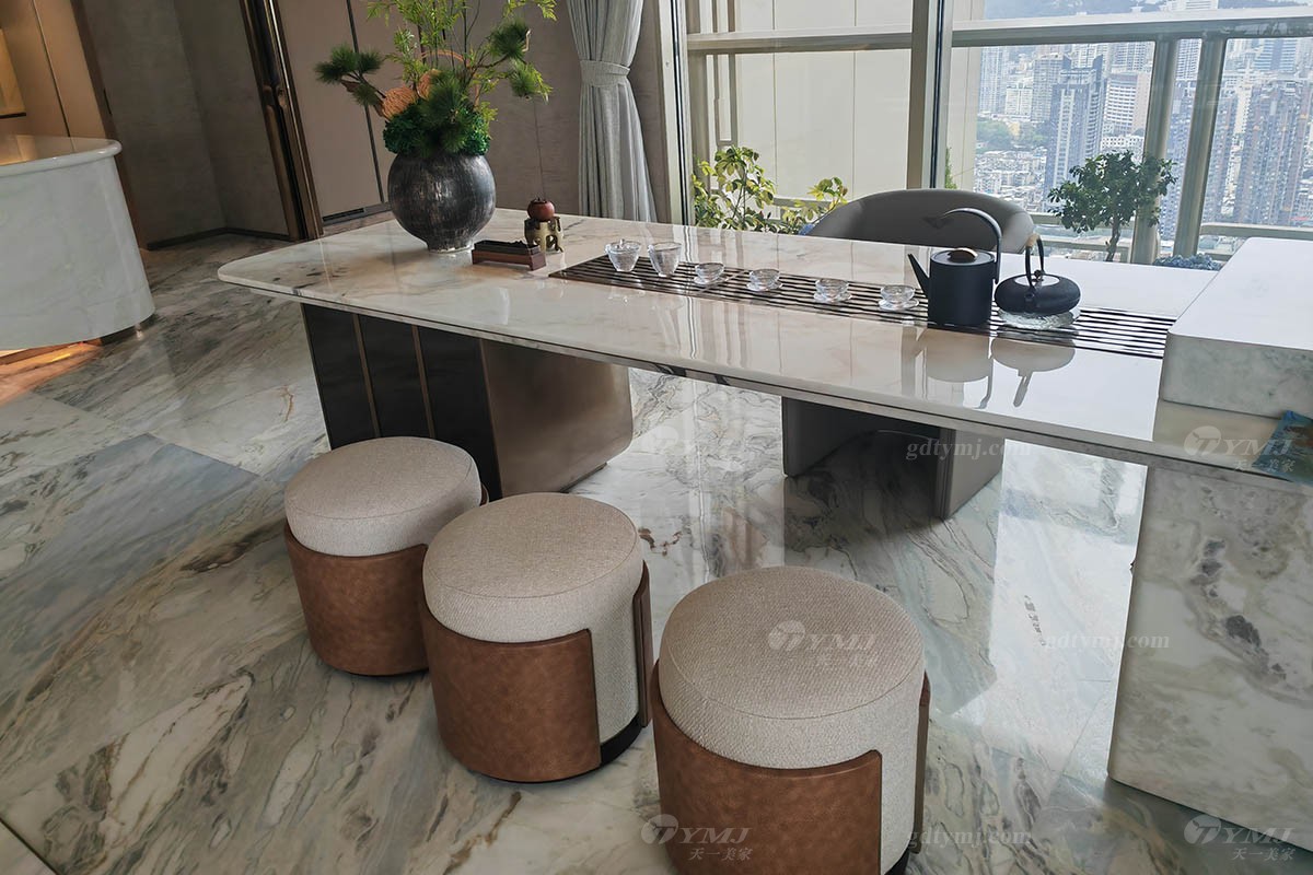 開放式的茶室區(qū),視野非常開闊,空間通透,同樣采光充足,中間一張長達(dá)2米多的大理石長茶臺,由精選天然白色大理石結(jié)合實木精心打造而成,鑲嵌金屬條配飾,細(xì)節(jié)感滿滿。閑余時分,約上三五知己抑或獨自一人,可一邊慢慢品茶一邊欣賞外面無盡美景,甚是愜意。