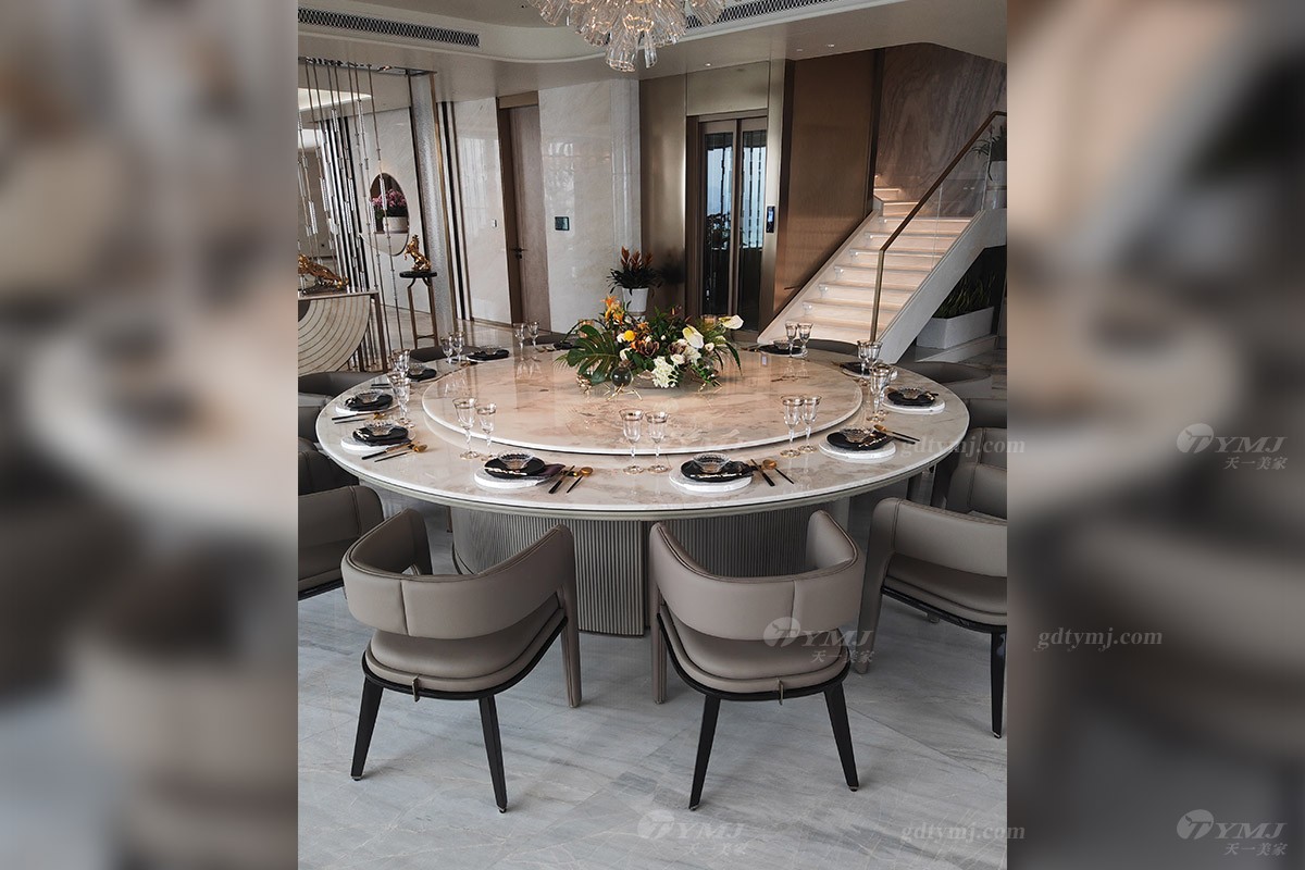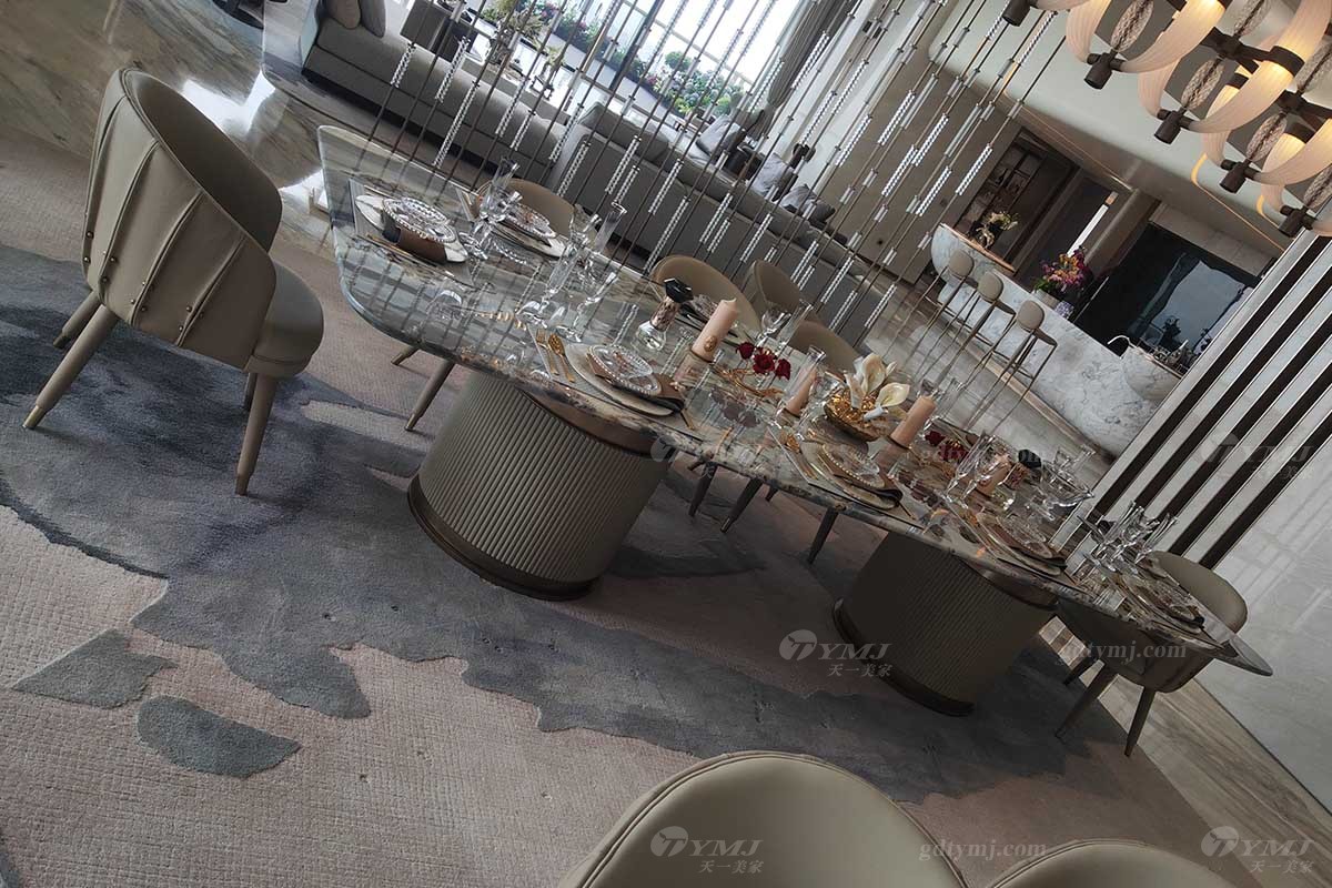 由客廳透過一道時尚的金屬裝飾隔斷,便是餐廳區(qū),餐廳區(qū)共分兩部分,分別為可容納10人座的西式大理石長餐桌,底座由兩個大圓柱體支撐著整個天然大理石臺面,奢華又大氣,讓你感受到來自西餐的浪漫。與之對應(yīng)的便是一張可容納12人的大圓形餐臺,時尚灰色皮藝餐椅,與圓餐臺大理石色調(diào)搭配完美融合、和諧統(tǒng)一,彰顯高雅、奢華感十足。