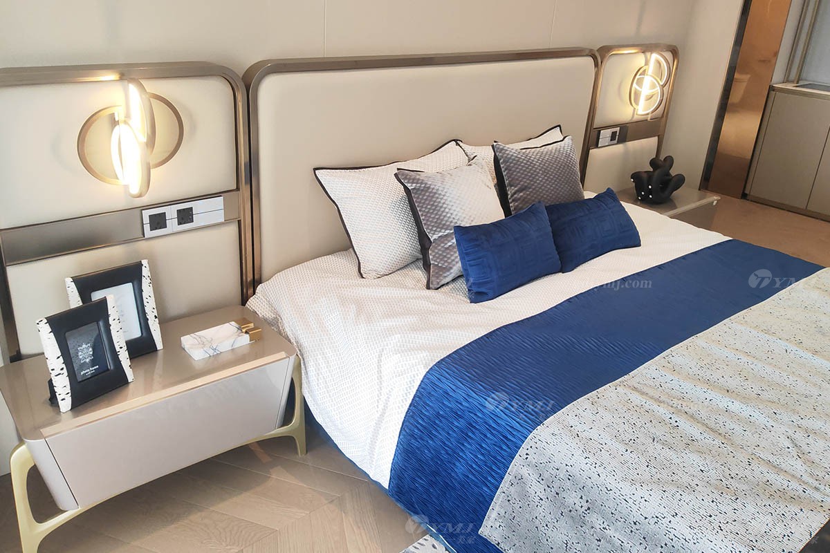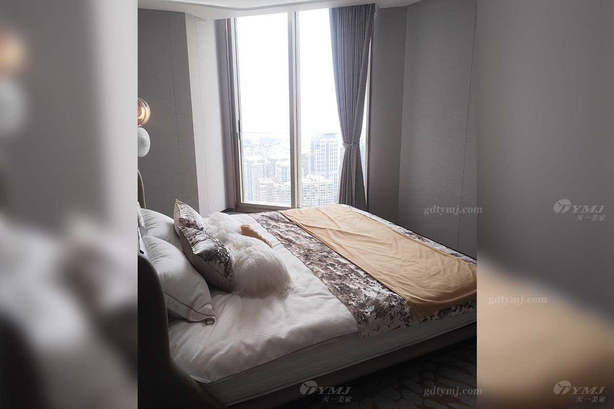 臥室自帶大陽臺,由超大落地玻璃窗隔絕了來自外界的喧囂與侵?jǐn)_,還室內(nèi)一片安寧,但是并不妨礙溫暖的陽光肆意灑進來,帶給人通透明亮的心境享受;寬大的床屏由金屬框架結(jié)合實木及布藝工藝精制而成,色調(diào)與墻壁背景色融為一體,低調(diào)而不失高雅,創(chuàng)意懸掛式的床頭燈,形狀獨特,暖色調(diào)光源,增添了溫馨氛圍,整個臥室空間從設(shè)計到家具、軟裝搭配布局集奢華、實用性、溫馨舒適于一體。