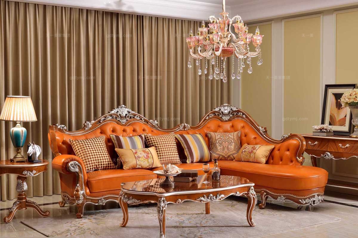 高端別墅品牌家具法式雕花橘紅色真皮轉(zhuǎn)角沙發(fā)