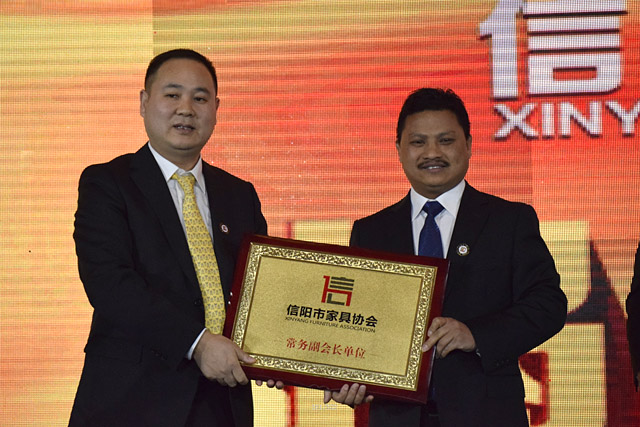 信陽市副市長包盛柏(左)為程一董事長頒發家具協會會長證書