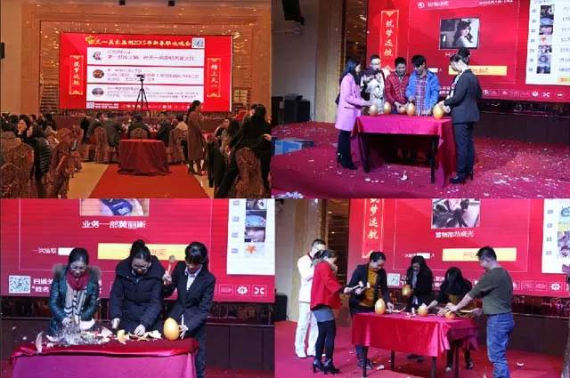 欣賞完陸惟華先生令人陶醉的書法藝術后,就進入期待已久的砸金蛋環節,今年天一美家晚會抽獎,摒棄了傳統陳舊的抽獎方式,采用了更現代化、科技化的微信大屏幕抽獎,進入年會會場了也不用擔心坐著無聊,主屏幕上微信墻已早早開放出來。在公司微信公眾號里回復關鍵詞,就可以馬上微信上墻,把自己想說的話投在屏幕上,與同事一起互動。
