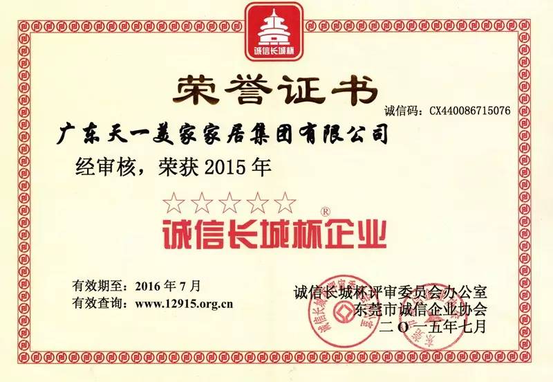 近日,廣東天一美家家居集團(tuán)有限公司榮獲由東莞誠信企業(yè)協(xié)會(huì)、誠信長城杯評(píng)審委員會(huì)辦公室、中企評(píng)協(xié)信用評(píng)級(jí)中心授予的“誠信長城杯”企業(yè)稱號(hào)、證書和牌匾。