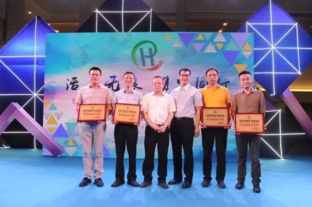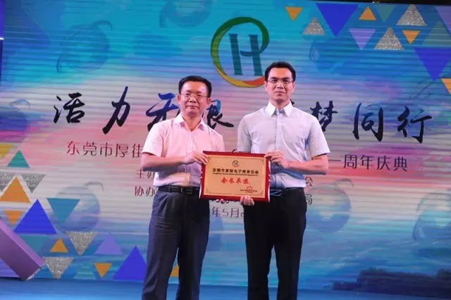 厚街鎮委書記、鎮人大主席萬卓培向東莞市厚街電子商務協會會長方建明授予“會長單位”