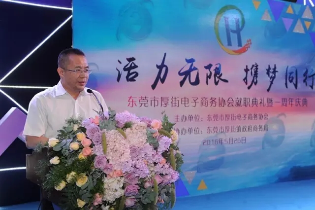 市商務局副局長黃朝東發表講話,祝賀東莞市厚街電子商務協會成立一周年,充分肯定了厚街電子商務協會過去一年的工作,并將積極指導厚街創建產業特色園區,繼續支持厚街電子商務發展。