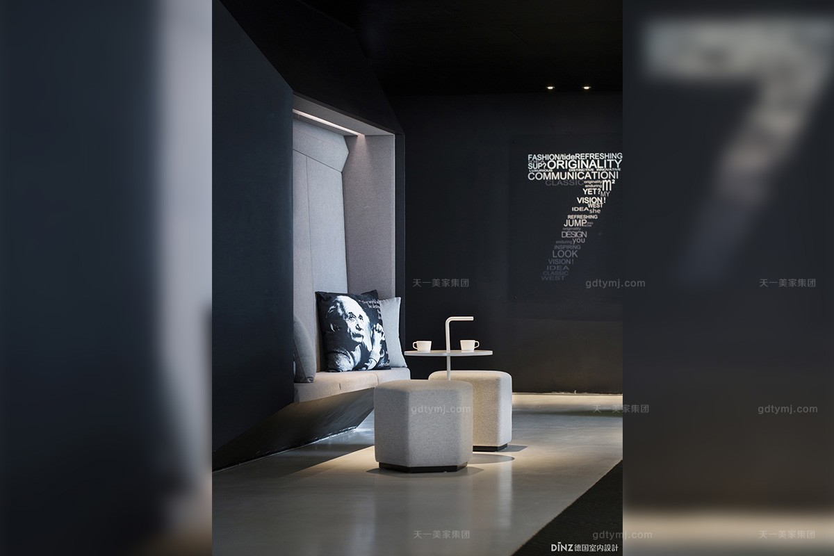黑漆立面與白色茶幾座椅相映成趣,幻化出現代高科技材料的光潔感,酷感十足。深色的地面、白色的天花與黑色立面白色地面,讓這個空間一半是肅穆,一半是活潑,營造了一個效率與放松兼得的辦公室設計空間。大面積地利用深色材質,與暖白色光搭配將空間的開放式設計體現得淋漓盡致,反映出辦公企業運作的公開氛圍,給人一種嚴謹而又不失輕松的職業化形象。