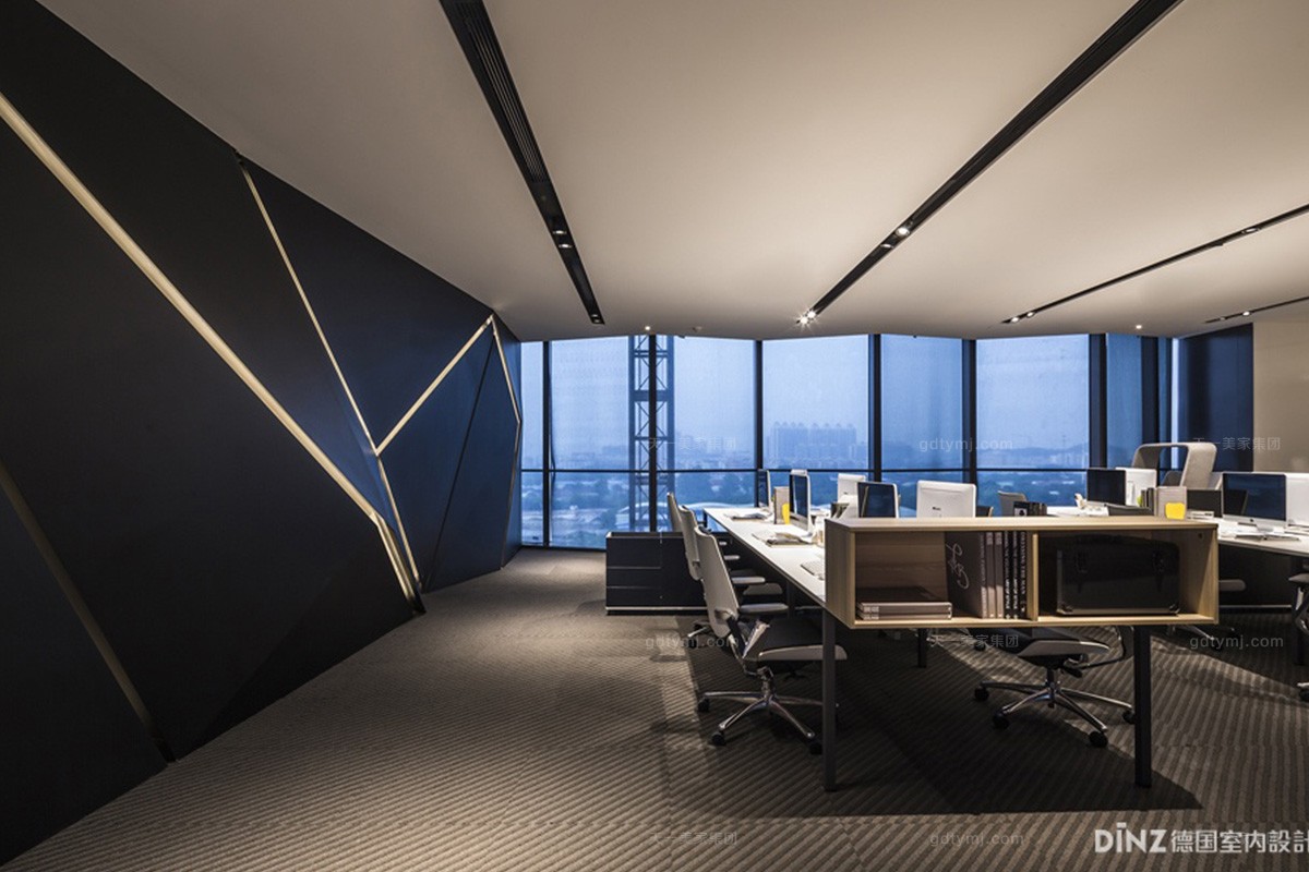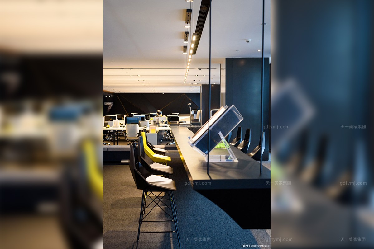 Contrast of black lacquer facade and white table seats creates the smooth texture of modern high-tech materials, which is very cool. The layout of dark ground, white ceiling and black facade and white ground makes the environment solemn but lively, creating an efficient and relaxed office design space. Large use of dark textures and the matching of warm white light have incisively and vividly given expression to the open design of the space, reflecting the open atmosphere of the office enterprise operation and giving a rigorous but relaxed professional image.