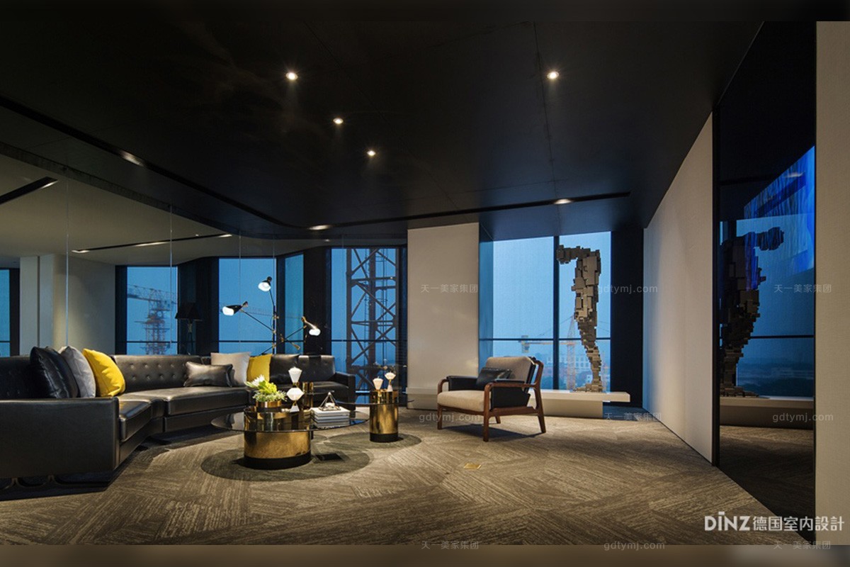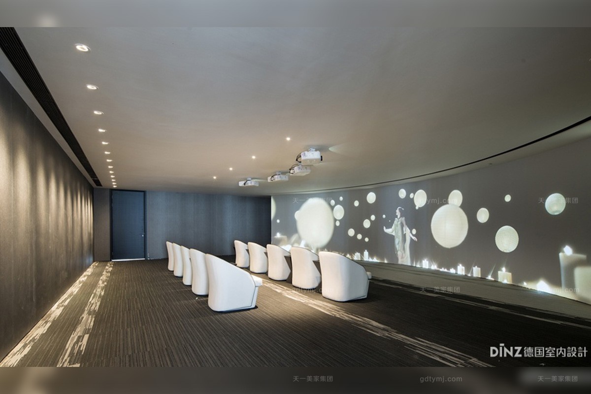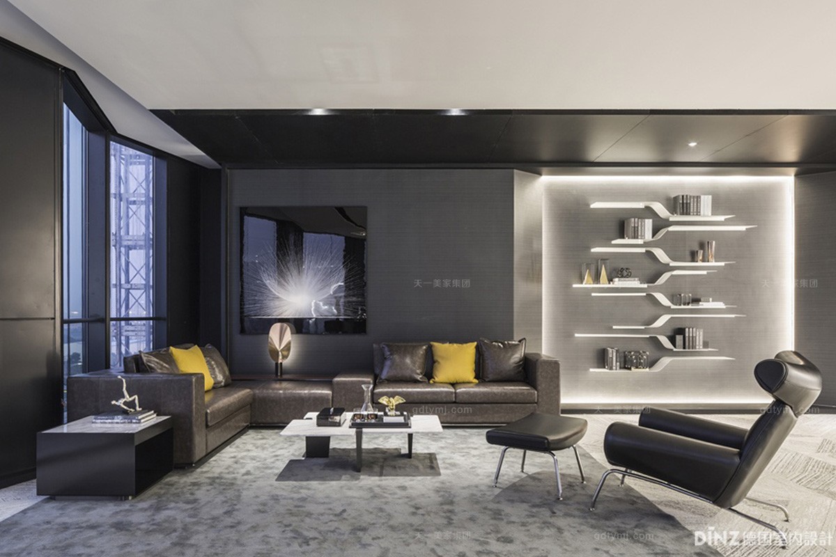 The facade vertical screen decorated by geometry lines combines with u-type staircase to cleverly separate negotiation area and the reception area. The decoration of valued matte black is simple and smooth, has the spacial feature of block surface formed by lines, waves, black and white. Therefore, the light highlights the white vertical three-dimensional layering and the black part uses the LED linear tape lights to draw the outline of U-shape flow lines.
