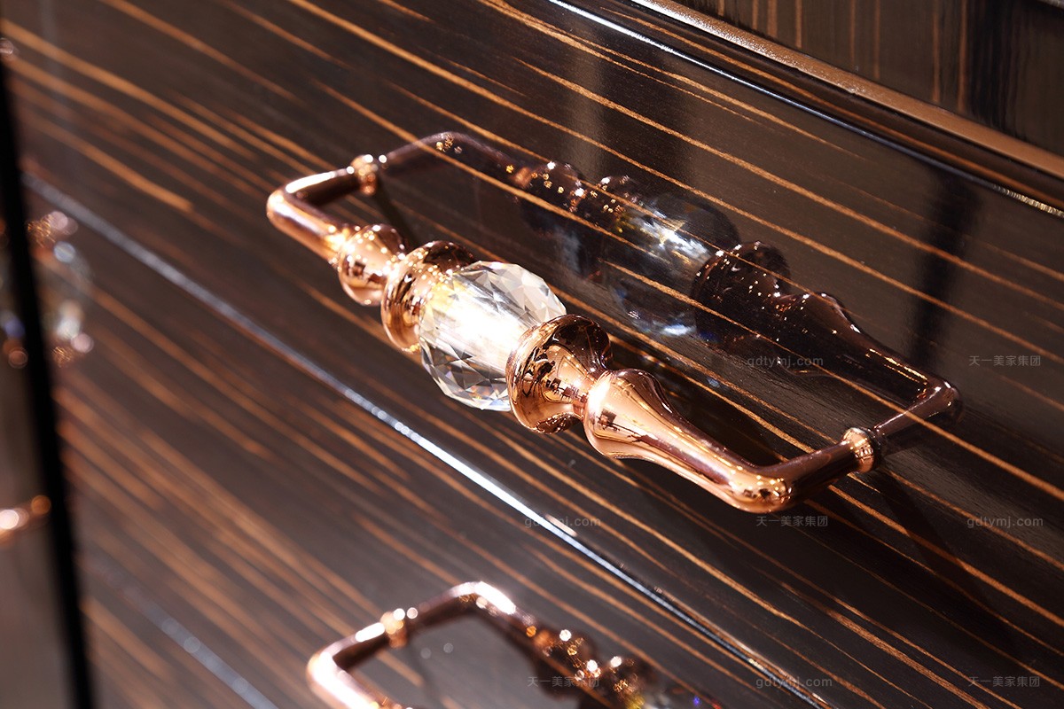 天一美家輕奢后現代奢華整體家具設計是獨特的,從甄選世界各地優質的五金、水晶、石材、布藝、皮革、木質多元素的組合恰如其分,到不同質材、肌理的呈現統一到優雅的知性色調中,散發濃郁的藝術氣息,獨具的設計概念和至臻的工藝品質,恰恰讓使用者有一種內心的安謐感。